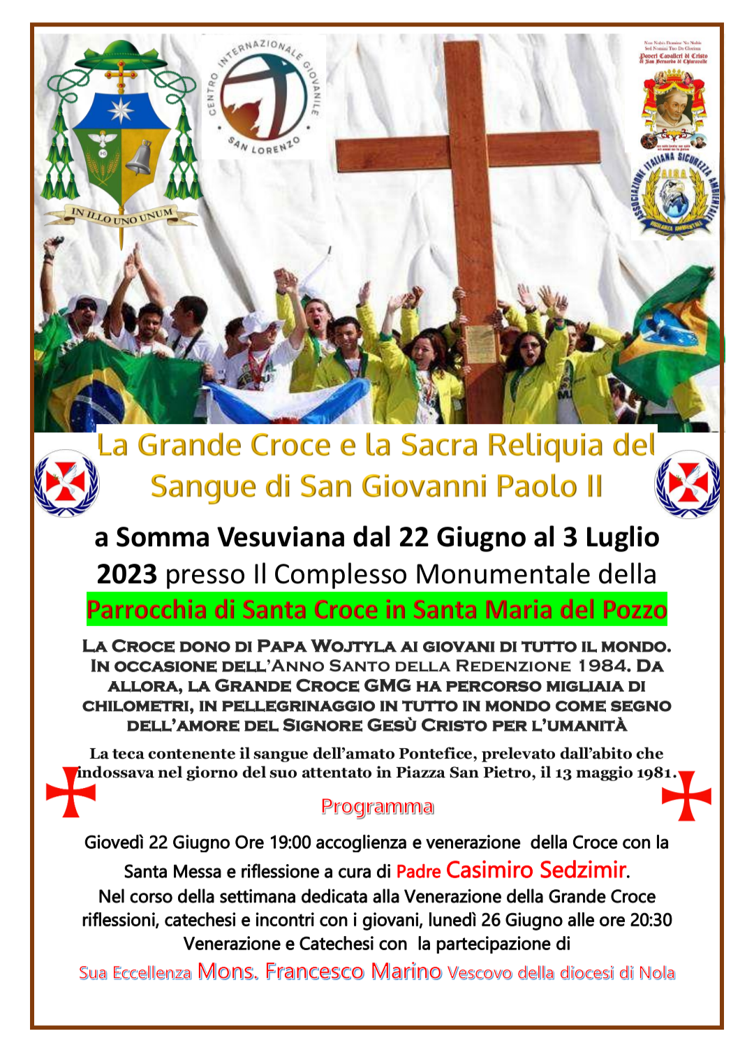 La Croce è quella che Papa Wojtyla donò ai giovani di tutto il mondo in occasione del Giubileo straordinario della Redenzione del 1984. Da allora, la “croce dei giovani” ha percorso migliaia di chilometri, in pellegrinaggio in tutto in mondo, seguendo gli itinerari delle Giornate mondiali della gioventù. Il sangue del Pontefice, contenuto in una teca, è stato prelevato dall’abito che indossava nel giorno del suo attentato in Piazza San Pietro, il 13 maggio 1981.