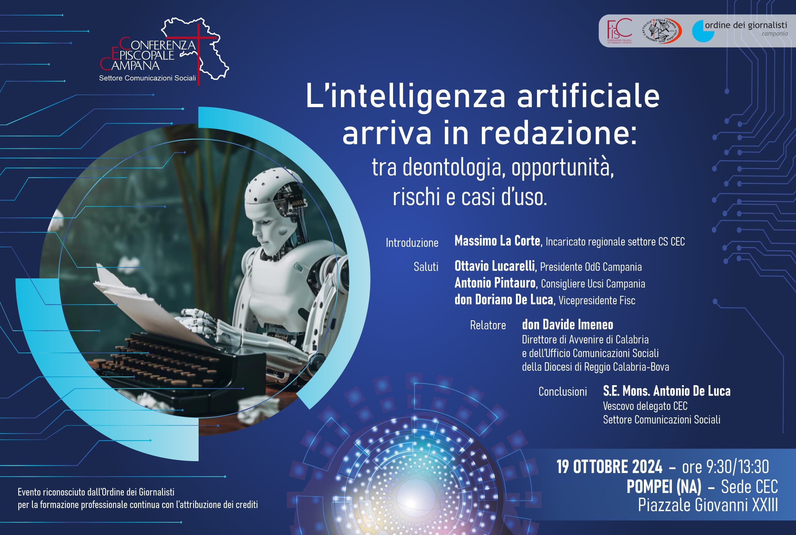 Sabato19 ottobre, dalle ore 9:30, presso la sede della Cec a Pompei, si terrà l’incontro sul tema: “L’intelligenza artificiale arriva in redazione: tra deontologia, opportunità, rischi e casi d’uso”, organizzato in collaborazione con l'Ordine dei giornalisti della Campania, l'Unione cattolica stampa italiana Campania, la Federazione italiana stampa cattolica.