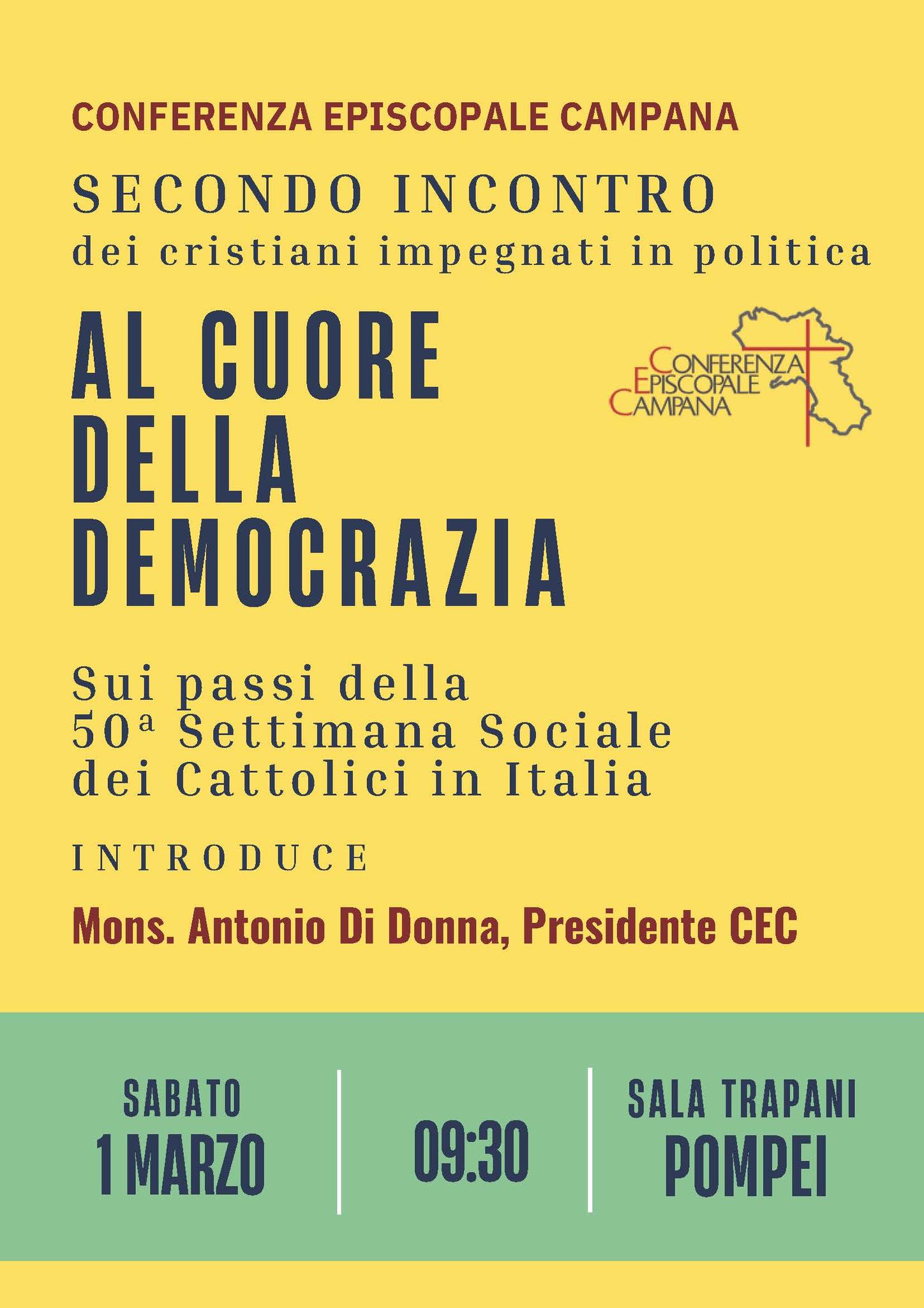 Prosegue il percorso “Al cuore della democrazia” promosso dalla Conferenza episcopale campana (Cec) per i cristiani impegnati in politica. Dopo il primo confronto del 14 dicembre scorso che ha segnato l’avvio di un tavolo di confronto dei gruppi di ispirazione cristiana che operano nella regione Campania, il prossimo appuntamento è per domani, sabato 1 marzo, alle 9:30, presso la sala Trapani di Pompei.