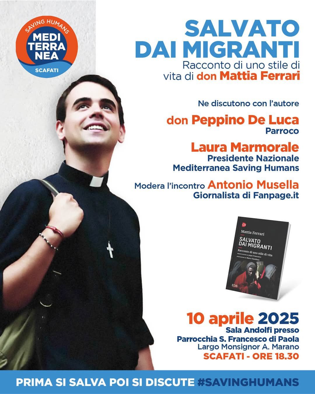 Domani, 10 aprile, alle 18:30, presso la sala Andolfi della parrocchia San Francesco di Paola in Scafati, si discute dell'ultimo libro scritto dal cappellano della Mediterranea Saving Humans, don Mattia Ferrari dal titolo "Salvato dai migranti. Il racconto di uno stile di vita", con la prefazione di Papa Francesco.