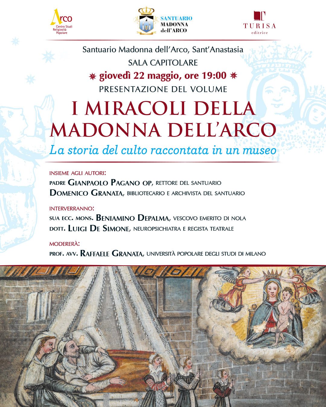 Domani, giovedì 22 maggio alle ore 19:00, presso la Sala capitolare dell chiostro seicentesco del Convento del Santuario della Madonna dell’Arco a Sant’Anastasia (Na), sarà presentato il libro "I Miracoli della Madonna dell’Arco. La storia del culto raccontato in un museo", realizzato da Padre Gianpaolo Pagano, rettore del Santuario, e Domenico Granata, da oltre venti anni, responsabile della Biblioteca e dell’Archivio dell’ente ecclesiastico.