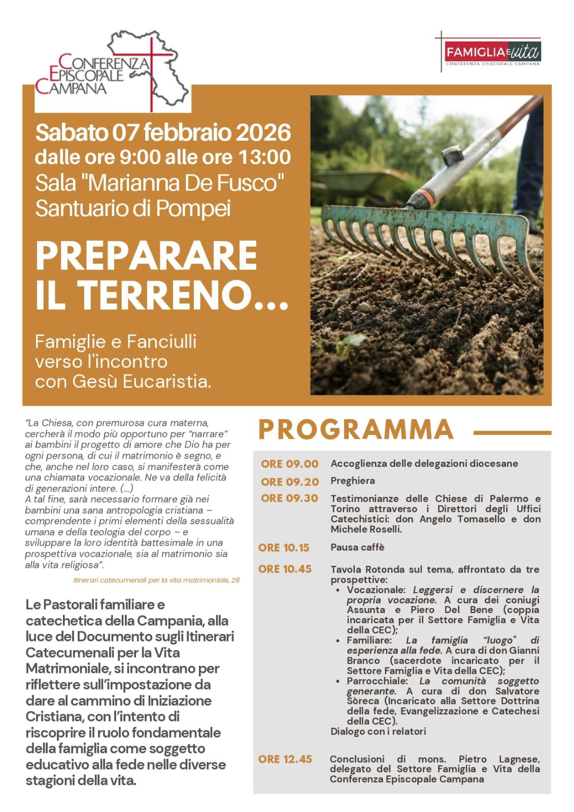 La Conferenza Episcopale Campana (Cec) promuove un’importante giornata di riflessione e confronto dal titolo “Preparare il terreno... Famiglie e Fanciulli verso l’incontro con Gesù Eucaristia”. L’appuntamento è per domani, sabato 7 febbraio, dalle 9:00 alle 13:00, presso la Sala "Marianna De Fusco" del Santuario di Pompei.