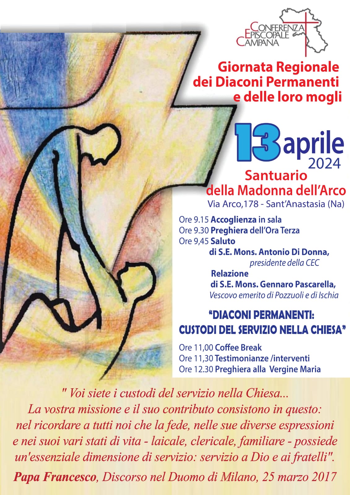 Il prossimo 13 aprile, dalle 9:15 alle 12:30, presso il Santuario di Madonna dell'Arco in Sant'Anastasia, si terrà la consueta Giornata regionale dei diaconi permanenti e delle loro mogli, promossa dalla Conferenza episcopale campana (Cec).