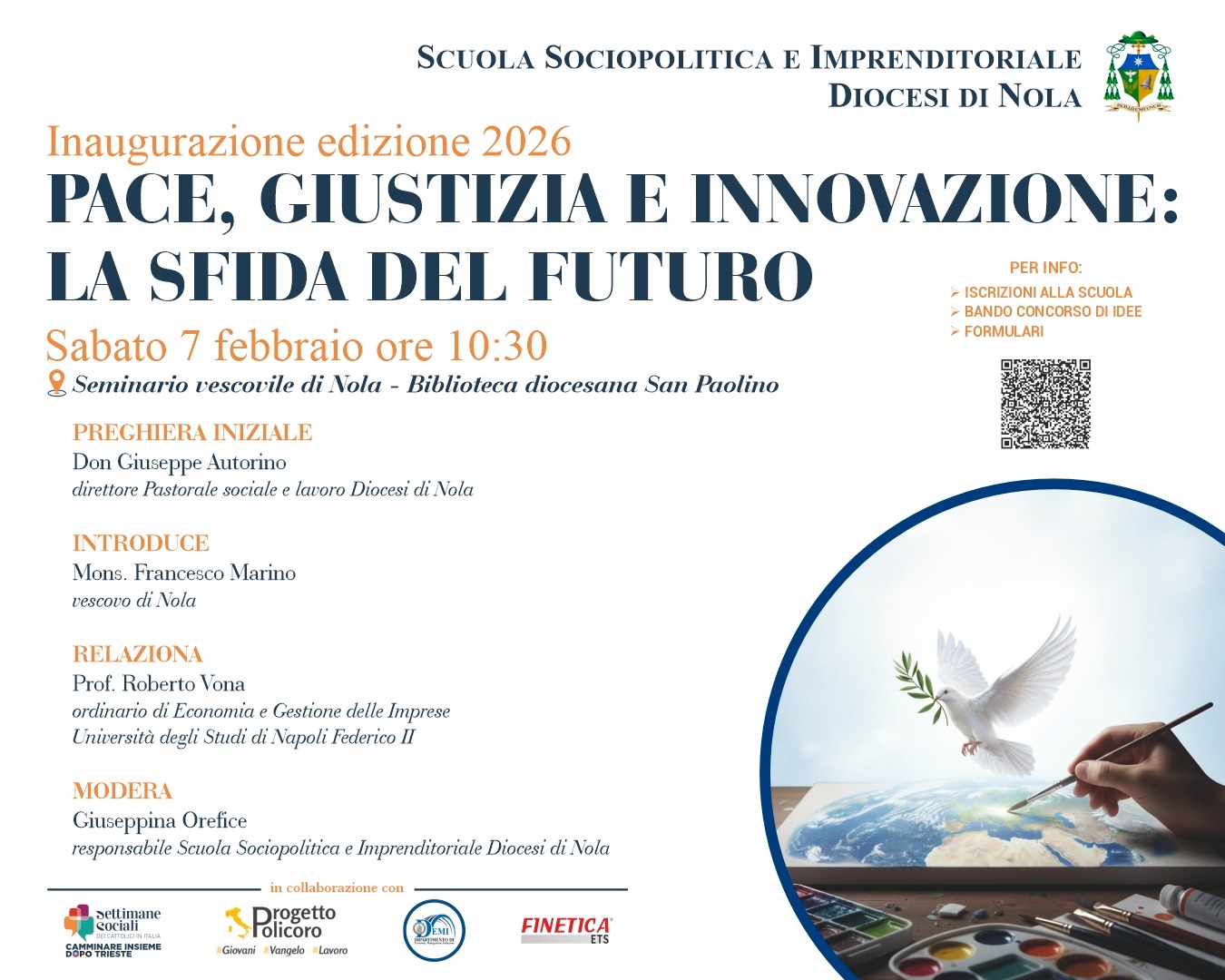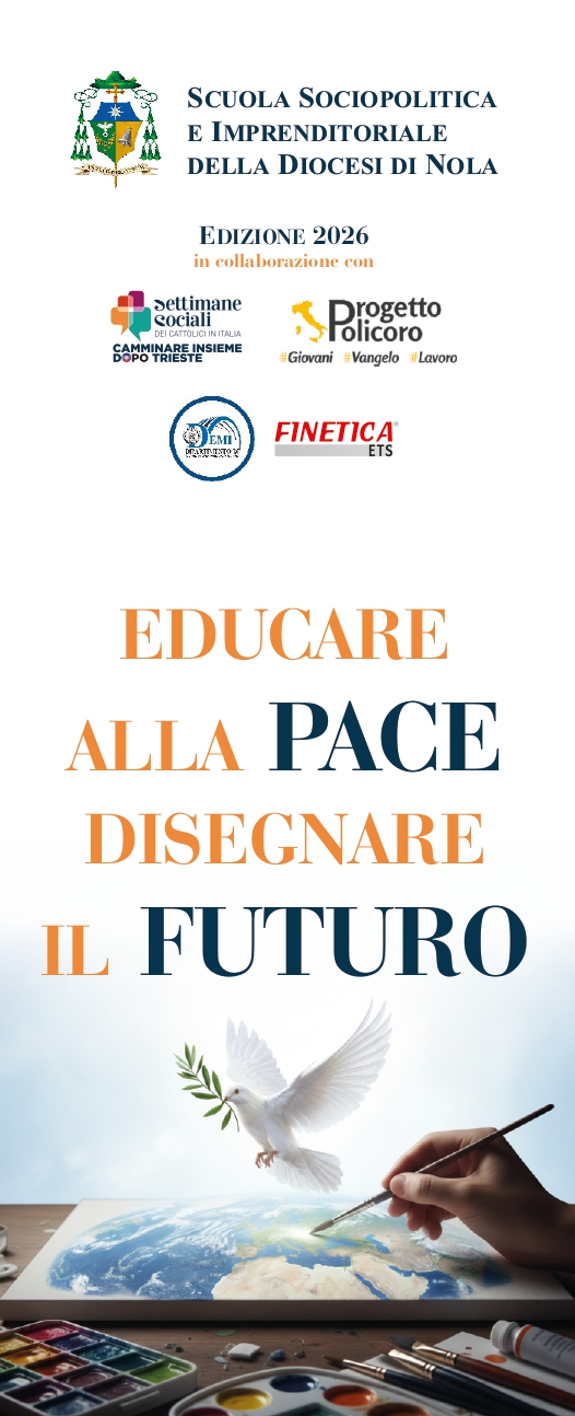 Frutto di una sinergica collaborazione tra gli uffici di pastorale sociale e il Progetto Policoro della Diocesi di Nola, in collaborazione con l'Università degli Studi di Napoli Federico II e Finetica Ets, la Scuola sociopolitica e imprenditoriale quest'anno sarà dedicata al tema “Educare alla pace. Disegnare il futuro”.