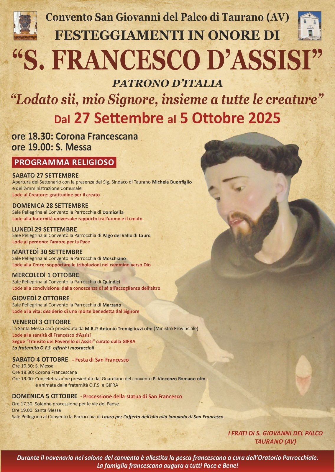 Gli appuntamenti in onore del Santo patrono d'Italia, celebrato sabato 4 ottobre, nelle comunità del Vallo di Lauro sono iniziati il 27 settembre per concludersi domenica 5 ottobre con la processione della statua di San Francesco. Il percorso di confronto con la testimonianza di fede del Santo poverello d'Assisi è promosso dai frati francescani del Convento San Giovanni del Palco di Taurano.