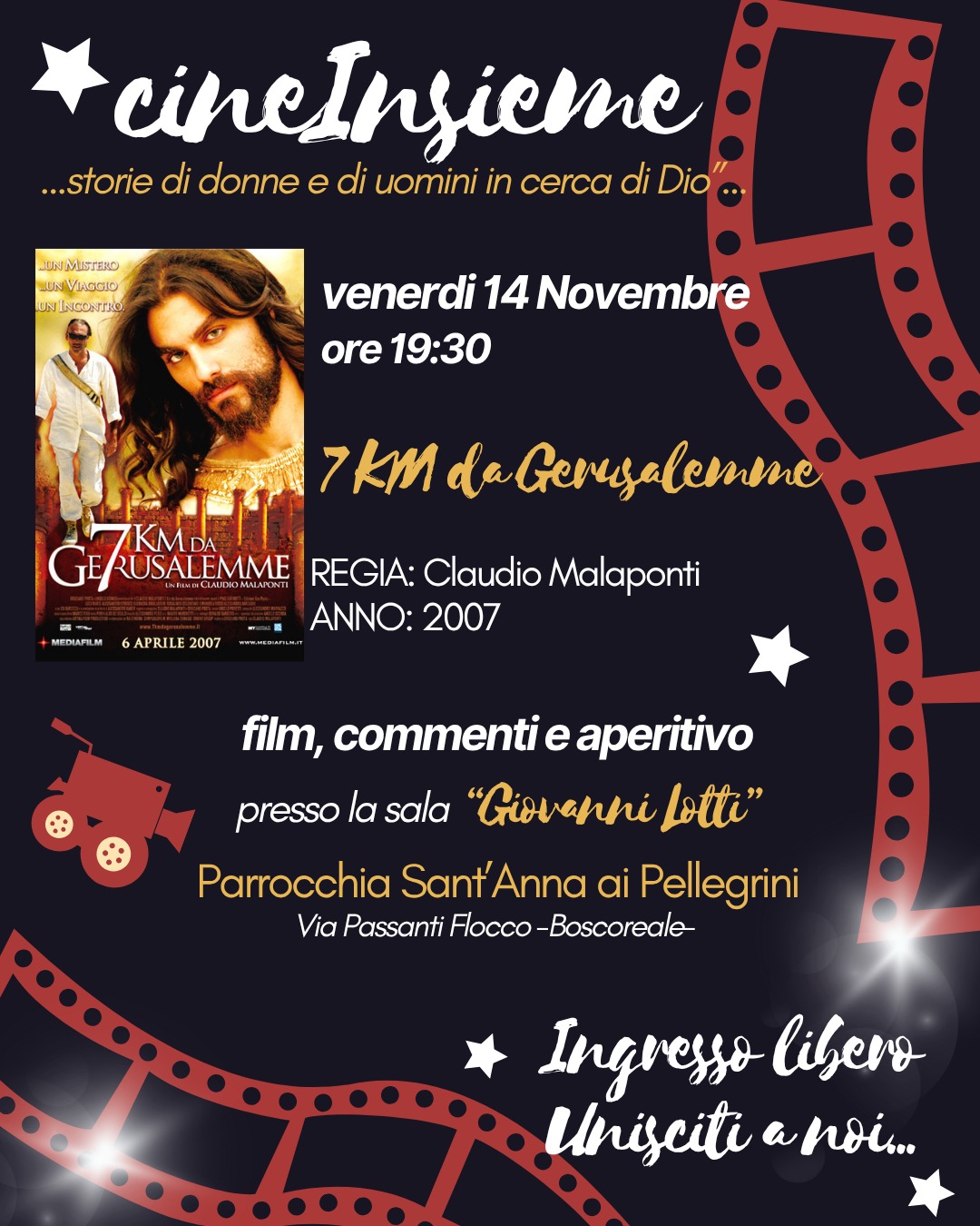 L'appuntamento è alle 19:30 presso la biblioteca parrocchiale intitolata al defunto diacono Giovanni Lotti. Il programma prevede una struttura di otto film a cadenza mensile e il primo ad essere proiettato è "7 Km da Gerusalemme" con la regia di Claudio Malaponti. «Quella del cineforum è un'iniziativa che abbiamo pensato insieme ad alcuni laici della comunità. Iniziativa che coinvolge tutta la comunità parrocchiale e non solo. Miriamo ad approfondire e a riflettere sul tema "cercatori di Dio...". Un viaggio tra storie, metafore e riflessioni profonde che mettono al centro l’uomo e la sua ricerca», ha spiegato don Ventre.