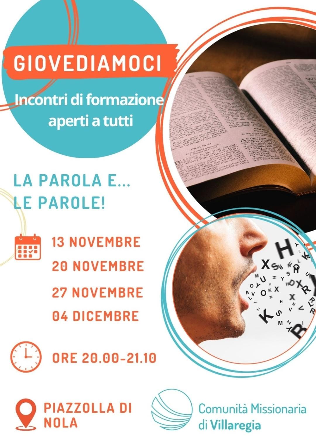 Giovedì 13 novembre avrà inizio il percorso di formazione sulla "Parole e....le parole" che si svolgerà presso la Comunità missionaria di Villaregia in Piazzolla di Nola con cadenza settimanale. La proposta è aperta a tutti ed è per tutti.