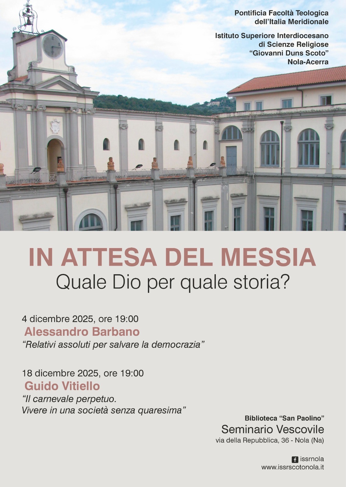 Ritornano gli appuntamenti "In attesa del Messia" promossi dall'Istituto superirore di Scienze religiose "G. Duns Scoto" Nola-Acerra. Ospiti dei due incontri in programma saranno il giornalista e saggista Alessandro Barbano e l’accademico e scrittore Guido Vitiello. Entrambi sono intivati a dialogare a partire dall'interrogativo "Quale Dio per quale storia".