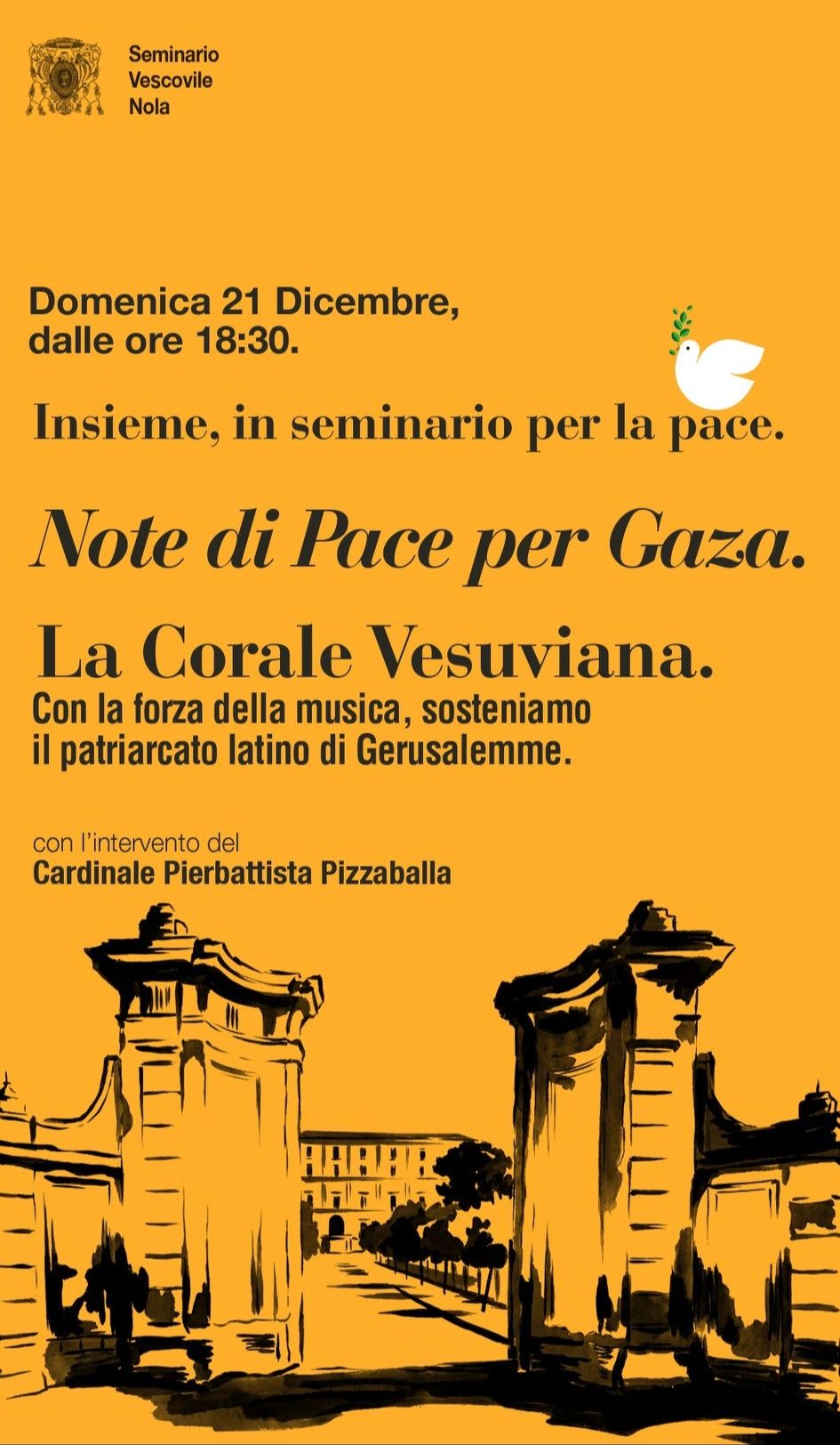 «Non un semplice momento di gioia natalizia né soltanto un’occasione di incontro per uno scambio di auguri ma un invito “gentile” e accorato insieme ad assumere la pace come orizzonte di ogni comportamento e la solidarietà come stile di vita: questo vorrebbe essere il concerto “Note di pace per Gaza” che si terrà domenica prossima 21 dicembre alle ore 18.30 nella Cappella maggiore del nostro seminario vescovile di Nola. Insieme al nostro vescovo ascolteremo la testimonianza del cardinale Pizzaballa, patriarca latino di Gerusalemme, nella cui diocesi c’è la parrocchia cattolica di Gaza. Lì tutto è stato distrutto, e le piogge invernali hanno reso quella città una enorme pozzanghera dove la gente, che ha perso tutto, vive nell’acqua sotto le tende. C’è davvero bisogno di tutto. E insieme alle case occorrerà ricostruire rapporti, fiducia, speranza», ha concluso monsignor Iannone.