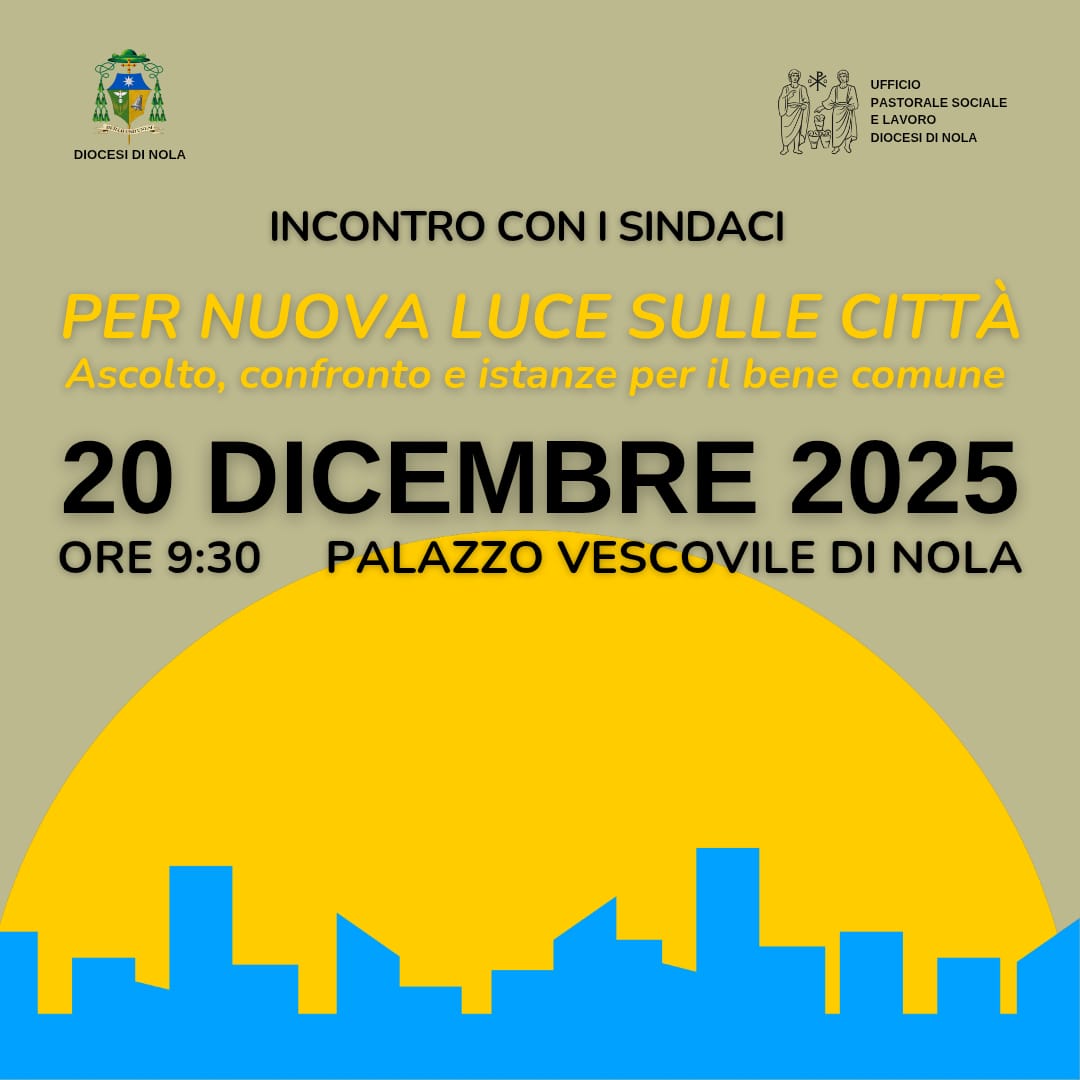 Sabato 20 dicembre 2025, alle 9:30, il Palazzo vescovile di Nola ospiterà l'iniziativa dal titolo "Per nuova luce sulle città" promossa dall'Ufficio di Pastorale sociale e lavoro (Psl) diocesano per un momento privilegiato di ascolto, confronto e condivisione tra il vescovo di Nola, Francesco Marino e i sindaci del territorio.