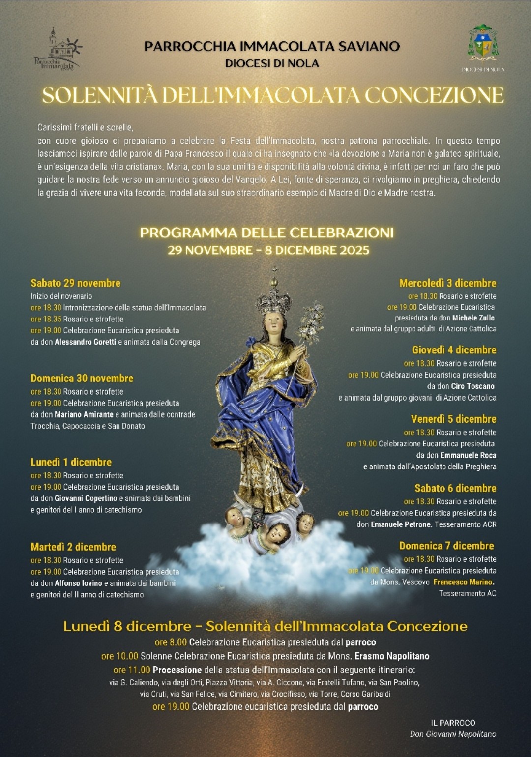 La comunità parrocchiale Immacolata Concezione di Saviano è pronta a vivere la festa della sua santa patrona. In attesa della Festa, domani, 7 dicembre a presiedere la Santa Messa sarà il vescovo di Nola, Francesco Marino. «Maria, con la sua umiltà e disponibilità alla volontà divina, è per noi un faro che può guidare la nostra fede verso un annuncio gioioso del Vangelo. A lei, fonte di speranza, ci rivolgiamo in preghiera chiedendo la grazia di vivere una vita feconda, modellata sul suo straordinario esempio di Madre di Dio e Madre nostra», ha scritto nel messaggio rivolto ai fedeli il parroco, don Giovanni Napolitano.
