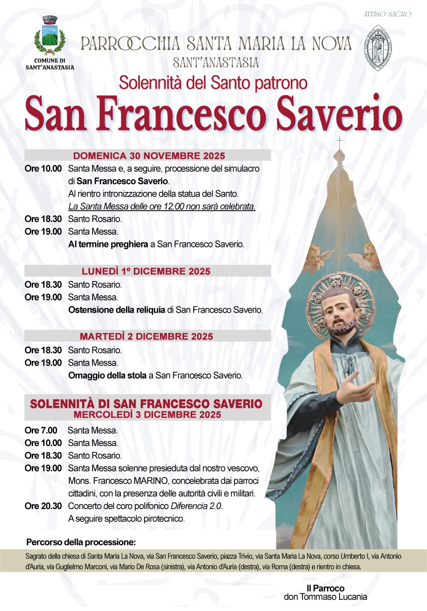 La parrocchia Santa Maria La Nova inSant'Anastasia festeggia il santo patrono cittadino, San Francesco Saverio. «Ci apprestiamo a vivere la festa del nostro Santo patrono Francesco Saverio- ha scritto nel suo messaggio ai fedeli il parroco don Tommaso Lucania-. Avvalorati dalla sua testimonianza di vita, il Signore Gesù possa donarci la gioia di essere Missionari d'Amore e la Vera Pace da offrire a quanti incontreremo».