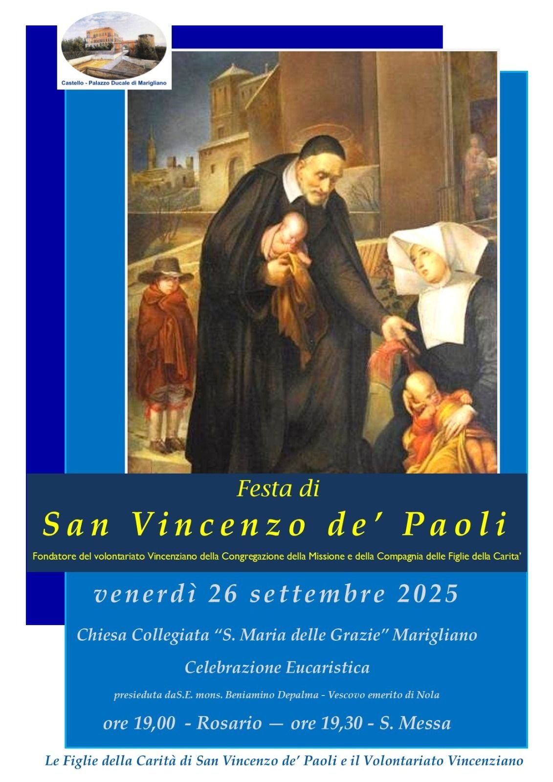 Le Figlie della Carità di San Vincenzo de' Paoli e il Volontariato Vincenziano si ritrovano domani, 26 settembre, presso la chiesa Santa Maria delle Grazie, nella Celebrazione eucaristica presieduta dal vescovo emerito della diocesi di Nola, monsignor Beniamino Depalma, per celebrare San Vincenzo de' Paoli, la cui festa liturgica ricorre il 27 settembre.