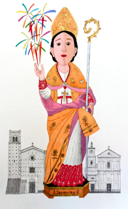 Per celebrare la conclusione di questo speciale anno, in collaborazione con inDialogo, l’illustratore napoletano Tiziano Squillace ha riletto, a misura di bambino, l’iconografia di san Severino mettendo in evidenza «la gioia dei fedeli delle due comunità - legate anche da un patto di amicizia - attraverso i fuochi pirotecnici colorati che sembrano generarsi dalla mano benedicente del patrono. Fuochi colorati che simboleggiano anche la sicura protezione percepita dagli abitanti di Comiziano e San Severino Marche, città rievocate attraverso le facciate della chiesa comizianese e della cattedrale marchigiana riprodotte sullo sfondo. Non poteva poi mancare - ha concluso Squillace - l’imponente pastorale, simbolo del servizio di guida di san Severino, invocato con forza ancora oggi».