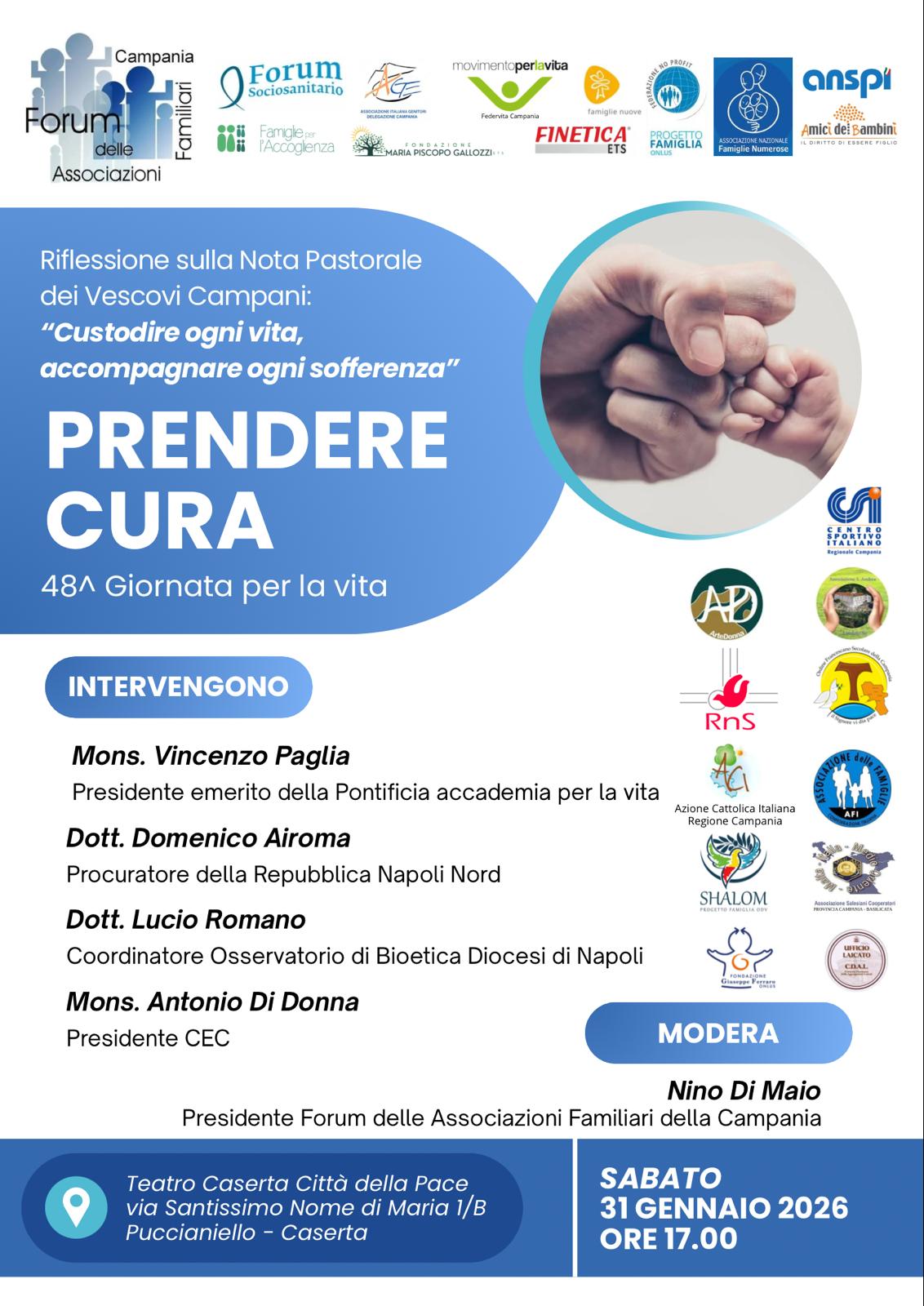 L’evento, che si terrà sabato 31 gennaio 2026 alle 17:00 presso il Teatro Caserta Città della Pace (Puccianiello), nasce come risposta corale alla Nota pastorale dei vescovi della Campania dal titolo “Custodire ogni vita, accompagnare ogni sofferenza” redatta lo scorso 8 dicembre e inviata a tutte le Chiese locali della regione. L’obiettivo dell’incontro è rimettere al centro del dibattito pubblico il valore della vita in ogni sua fase, con particolare attenzione alla fragilità e alla sofferenza. Infatti, la nota devi vescovi campani è nata «come risposta all’emergere di derive sempre più drammatiche, quali l’eutanasia, il suicidio assistito e l’abbandono terapeutico, e intende essere uno strumento di accompagnamento pastorale e culturale per le nostre comunità cristiane, perché siano sempre più testimoni credibili del Vangelo della vita. In un tempo in cui si fa strada una cultura della morte, alla luce del Vangelo e del Magistero della Chiesa, desideriamo rinnovare il nostro “sì” alla vita, alla cura, all’accompagnamento amorevole di chi soffre», si legge nel documento dei presuli campani.