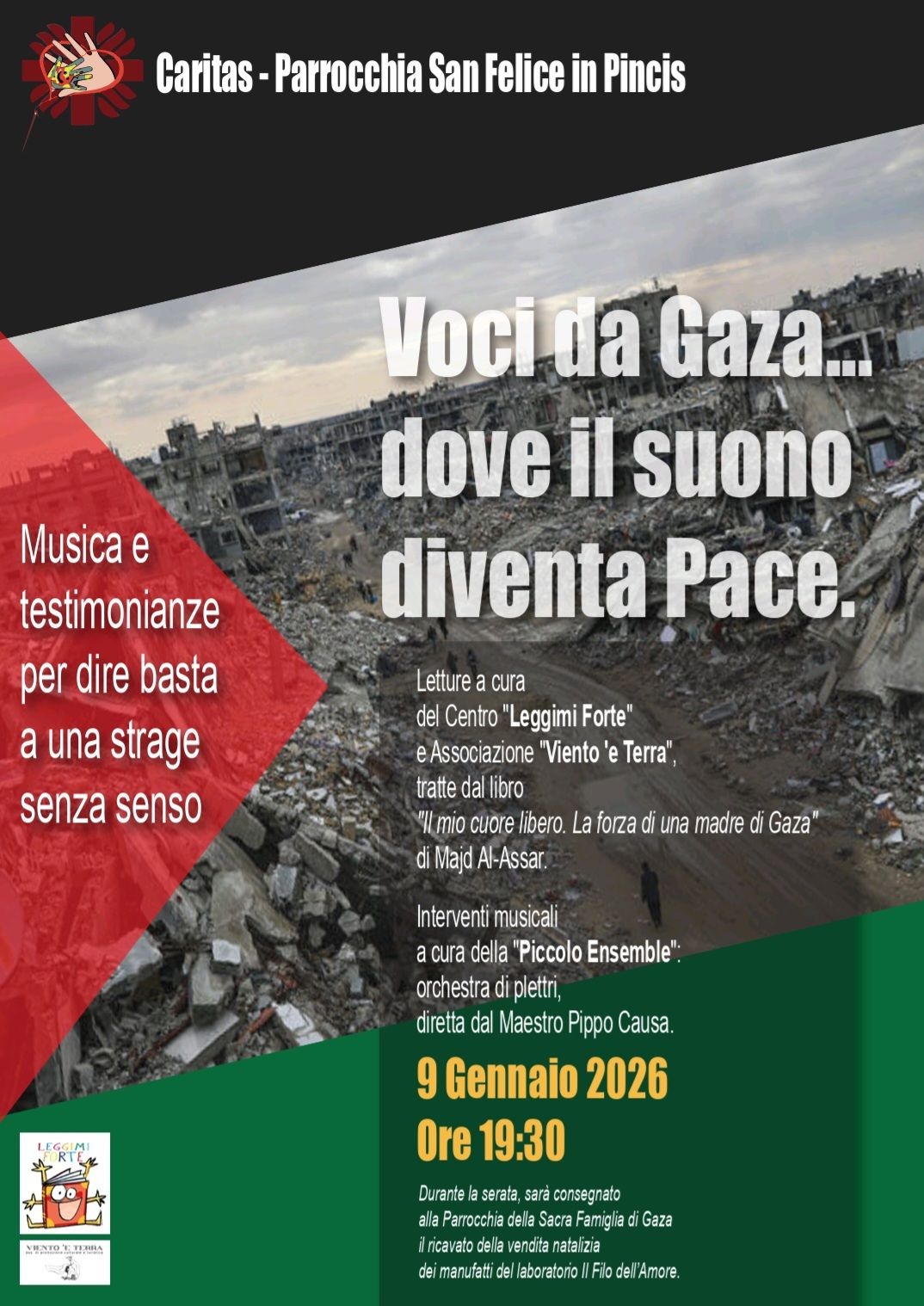 La Caritas della parrocchia San Felice in Pincis di Pomigliano d'Arco, in collaborazione con il Centro "Leggimi Forte" di Pasquale Avallone, promuove un momento di riflessione, solidarietà e musica per accendere i riflettori sulla drammatica situazione umanitaria nella Striscia di Gaza. L’evento, dal titolo “Voci da Gaza... dove il suono diventa Pace”, è in programma domani, 9 Gennaio 2026, alle 19:30.